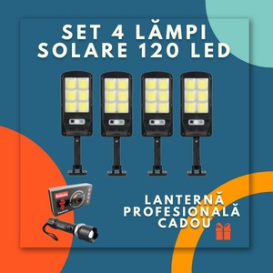 Set 4 X Proiector solar 6 celule, 30W, 120 LED, cu senzor de miscare + Lanterna multifuntionala Swat CADOU