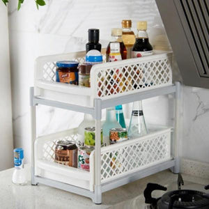 Etajera mica, cu doua rafturi culisante, potrivita pentru organizare si depozitare in bucatarie si baie. Oriunde o veti folosi, veti obtine spatiu suplimentar pentru depozitare. Fiecare sertar gliseaza in afara, ceea ce asigura accesul usor la articolele depozitate. Designul permite vizualizarea continutului din rafturi.