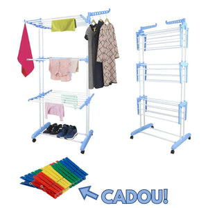Suportul de rufe cu nivel multiplu are 3 nivele si un raft inferior convenabil si practic pentru accesorii. Cele trei niveluri ofera 24 de tije pentru a atarna haine umede si lenjerie. Tijele sunt durabile si rezistente la coroziune, permitand folosirea suportului pentru haine pe o perioada lunga de timp. De asemenea, produsul dispune de doua manere extragatoare pe care puteti pune 14 umerase. Raftul inferior este, de asemenea, perfect pentru depozitarea clemelor si uscarea pantofilor.